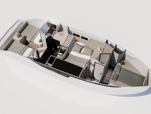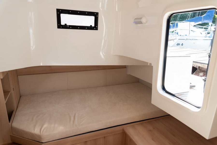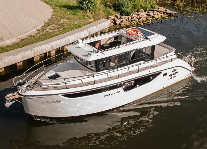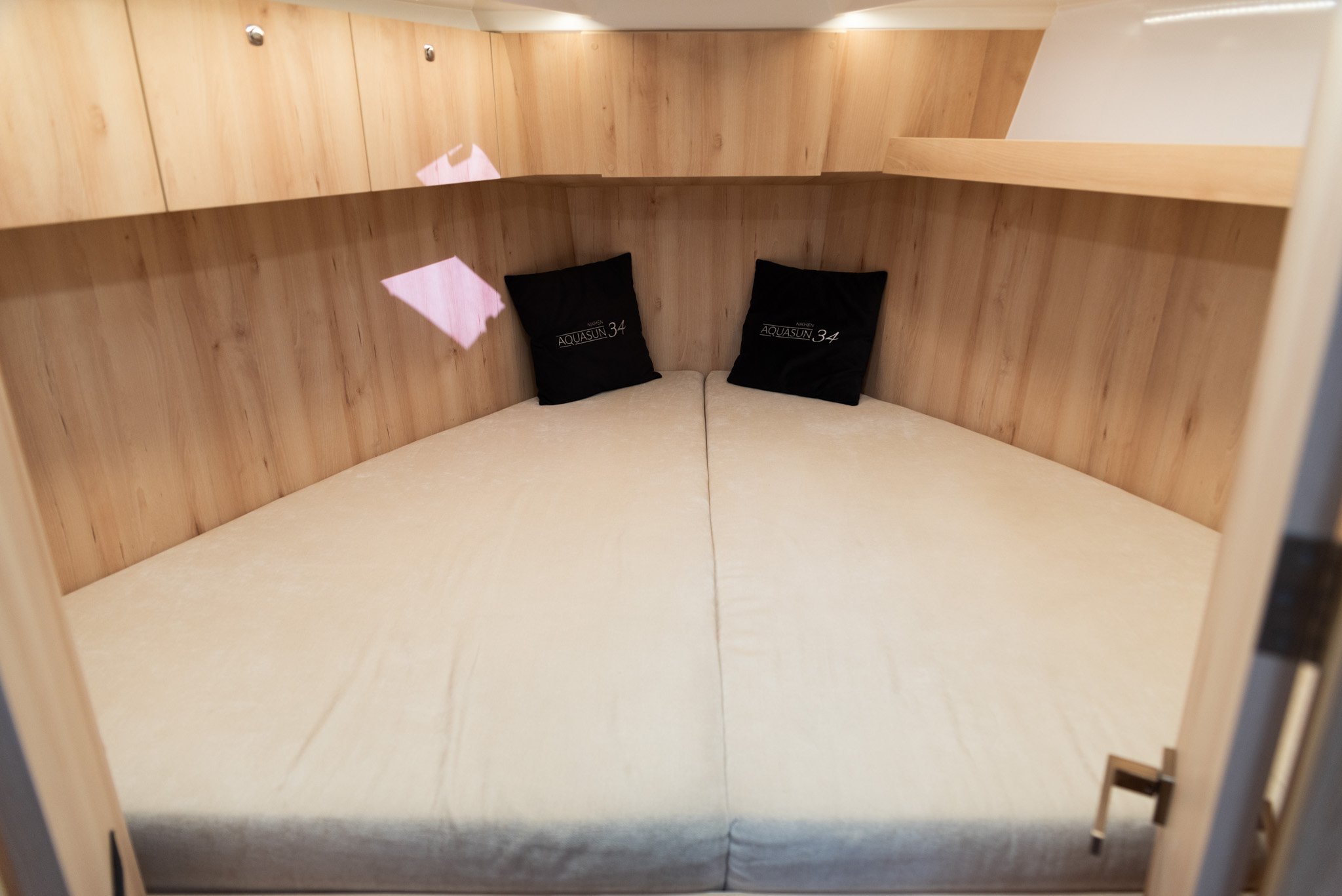 Nikhen Aquasun 34 AftCab to innowacyjny jacht motorowy, który obecnie nie ma sobie równych na rynku łodzi przeznaczonych do czarteru. Oferuje miejsce dla maksymalnie sześciu osób w trzech kabinach sypialnych. Podczas projektowania łodzi duży nacisk położono na przestrzeń i komfort w kabinach sypialnych. Przestronna tylna kabina o prawie stałej wysokości stojącej ok. 1,85 i dwa duże łóżka pojedyncze oraz własna łazienka z toaletą, umywalką i prysznicem są na pewno wyjątkowe. Tylna kabina ma własne wejście z kokpitu, a specjalną atrakcją jest również klapa bezpośredniego wyjścia na platformie kąpielowej. Kabina dziobowa z dużym trójkątnym łóżkiem zapewnia wygodne miejsce dla 2 osób, tutaj również przestrzeń nad głową w strefie wejściowej wynosi około 1,85 m. Środkowa kabina jest nieco bardziej płaska, ale oferuje obszerną część sypialną z podwójnym łóżkiem o wymiarach 1,95 x 1,70 m. Na dziobie jest druga łazienka, również z toaletą, umywalką i prysznicem.