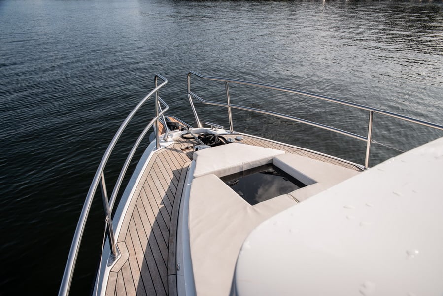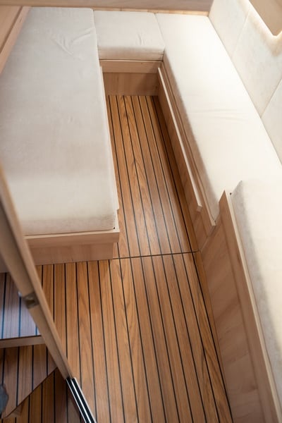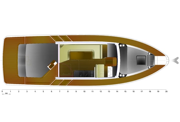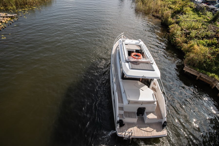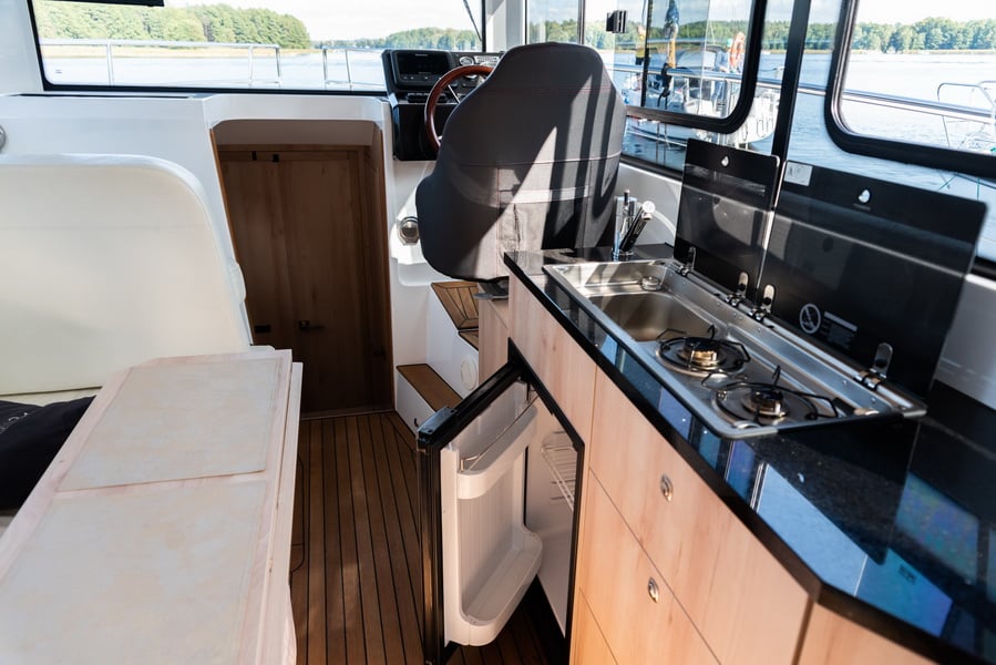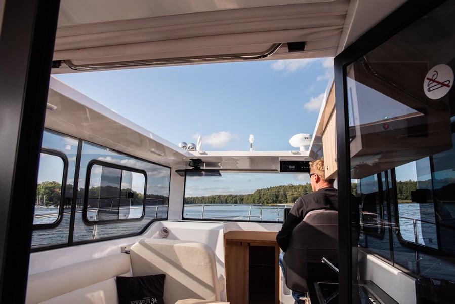 W górnej części kokpitu, obok przytulnej jadalni i aneksu kuchennego znajduje się stanowisko sterownicze z wygodnym fotelem kapitańskim. Dla jednego lub dwóch pasażerów istnieje również opcja siedzenia w kierunku jazdy przez złożenie części ławki. Dach kokpitu można prawie całkowicie otworzyć, dzięki czemu można cieszyć się słońcem i świeżym powietrzem w kokpicie w słoneczne dnii, jak na odsłoniętym tarasie. Jest również możliwość otwarcia kilku okien z boku. Na rufie łódź można prawie całkowicie otworzyć przez drzwi wraz z oknem,które dodakowo się składa. Duży pokład do leżakowania zachęca wielbicieli słońca do częstego opalania. Dzięki temu cała załoga może cieszyć się jazdą łodzią blisko sternika. Dodatkowy pokład do opalania znajduje się na dziobie. Z drugiej strony na rufie znajduje się duża platforma kąpielowa i ławki, z których można podziwiać widok na jezioro i poświęcić się zabawie w kąpieli lub łowić ryby w komfortowych warunkach.
