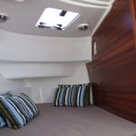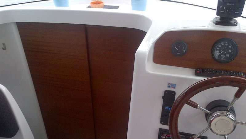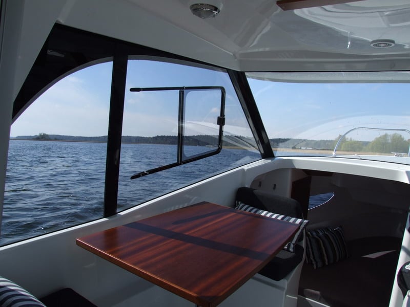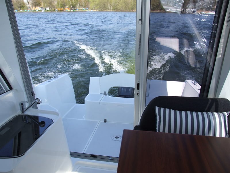 Łódź sprawia wrażenie bardzo przestronnej dzięki umieszczeniu kokpitu i obszernej sterówki na jednym poziomie przez co powstało jedno duże pomieszczenie przedzielone jedynie dużymi szklanymi przesuwnymi drzwiami 3 segmentowymi zamykającymi sterówkę. Mocno „przeszklona” sterówka pozwala sternikowi i całej załodze przebywającym razem obserwować otoczenie zarówno podczas żeglugi jak i na postoju oraz podczas odpoczynku, przygotowywania i spożywania posiłków itp. Wieczorami i w chłodniejsze dni sterówka może zostać oddzielona od reszty kokpitu szklanymi przesuwanymi drzwiami i będzie wtedy integralną częścią kabiny mieszkalnej.