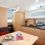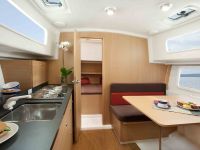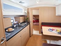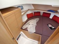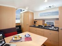 Jacht wyposażony w wygodne kanapy, niezależne kajuty oraz bogate wyposażenie dodatkowe tj. STER STRUMIENIOWY, ogrzewanie WEBASTO, radio, TV z DVD, lodówkę, kuchnię, WC morskie, zlew, umywalkę,